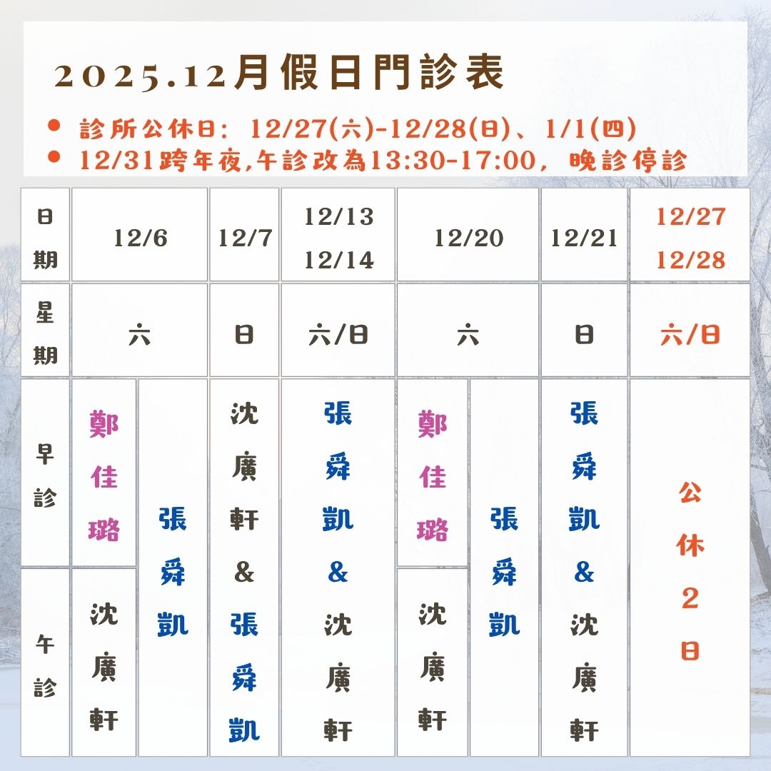 12月醫師班表|新增肉毒桿菌美容診(請透過專診預約)