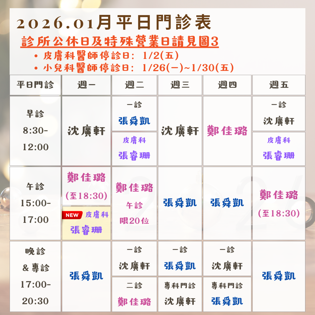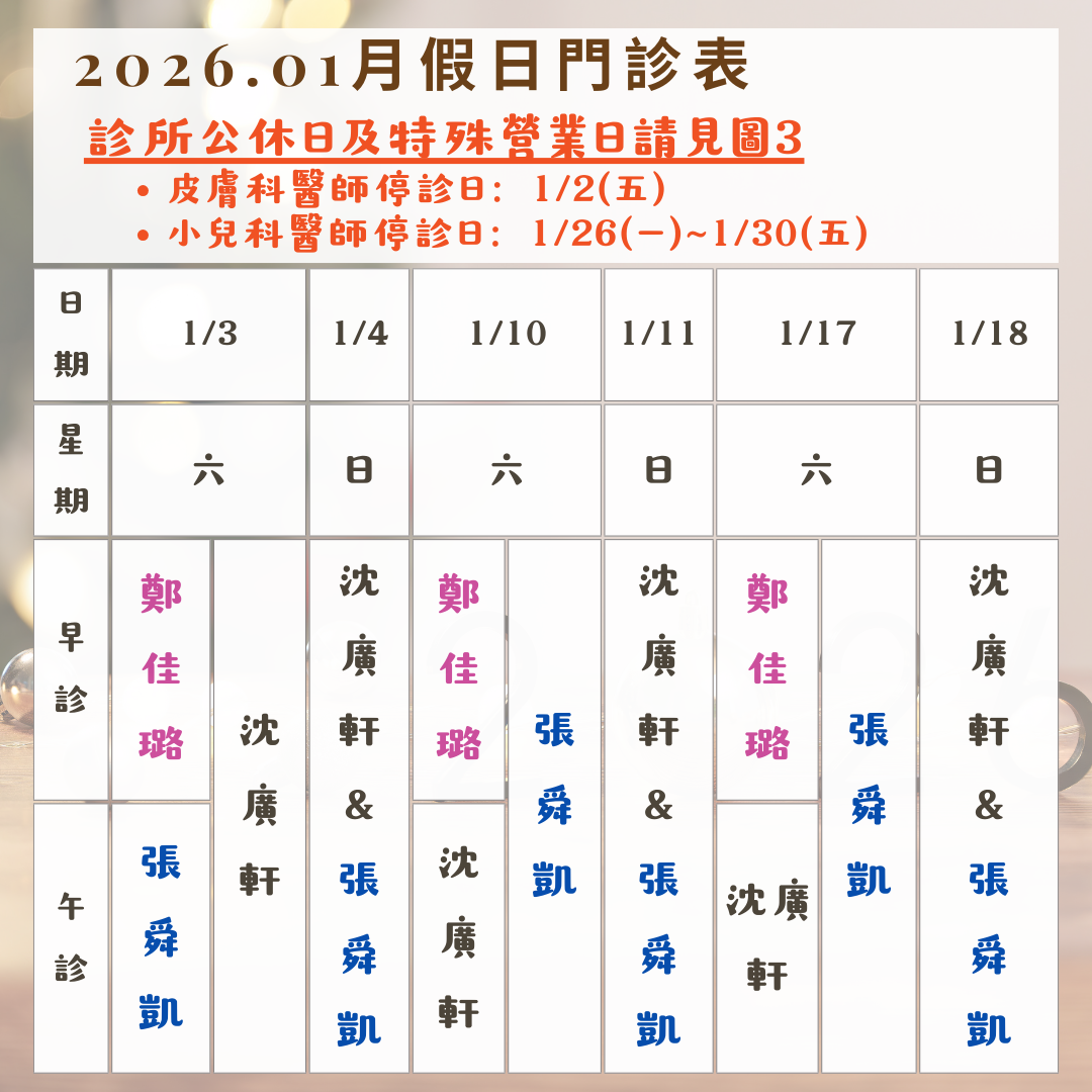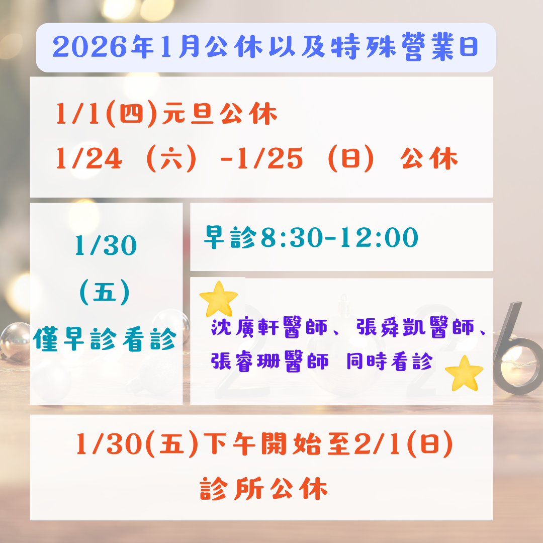 診所公休日:1/1(四)元旦、1/24(六)、1/25(日)、1/31(六)、2/1(日)